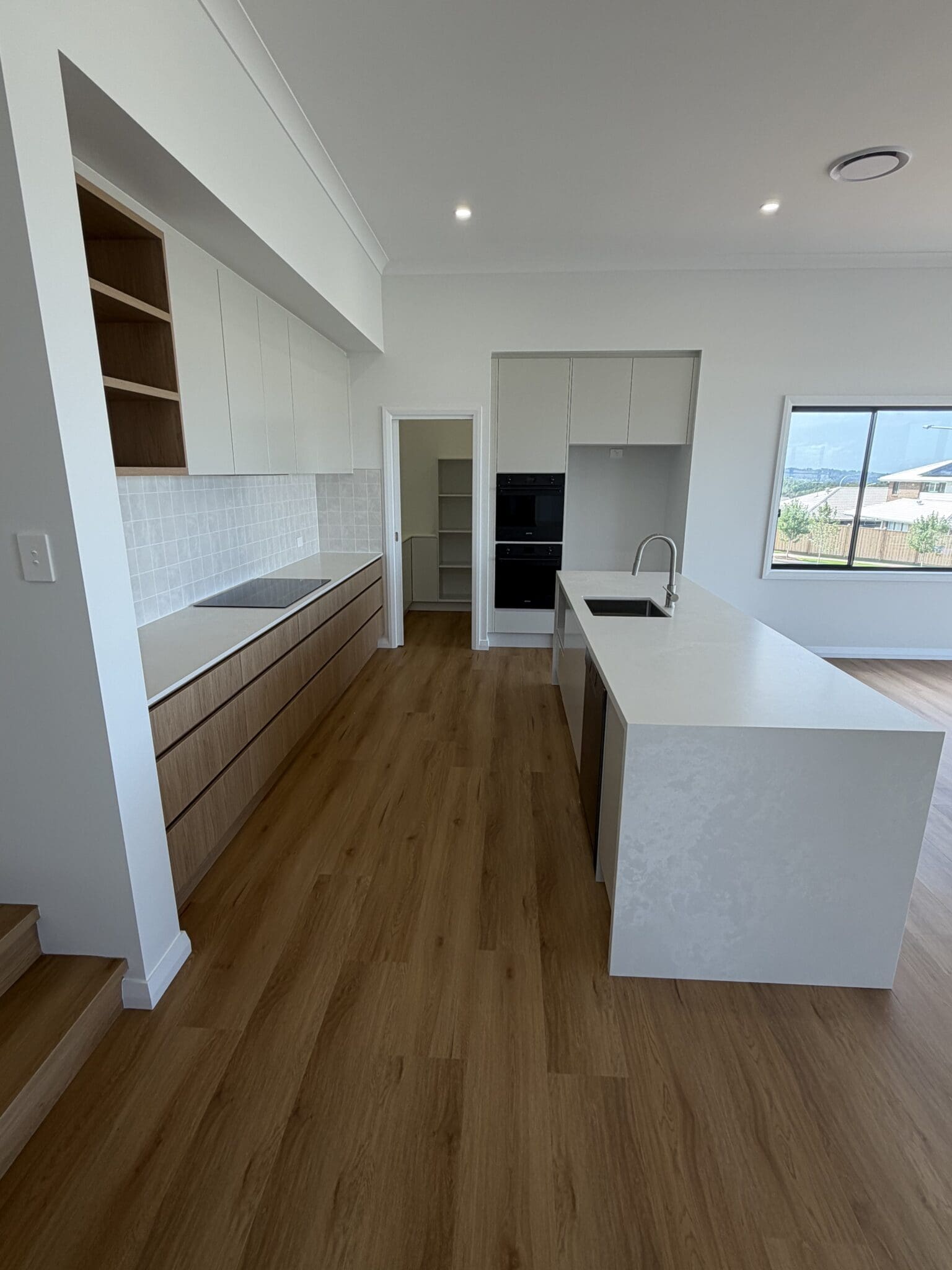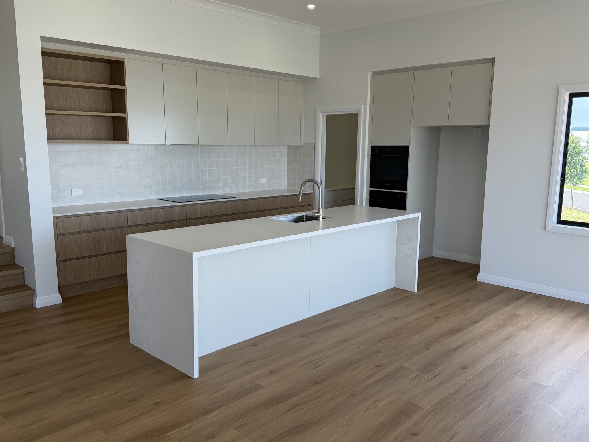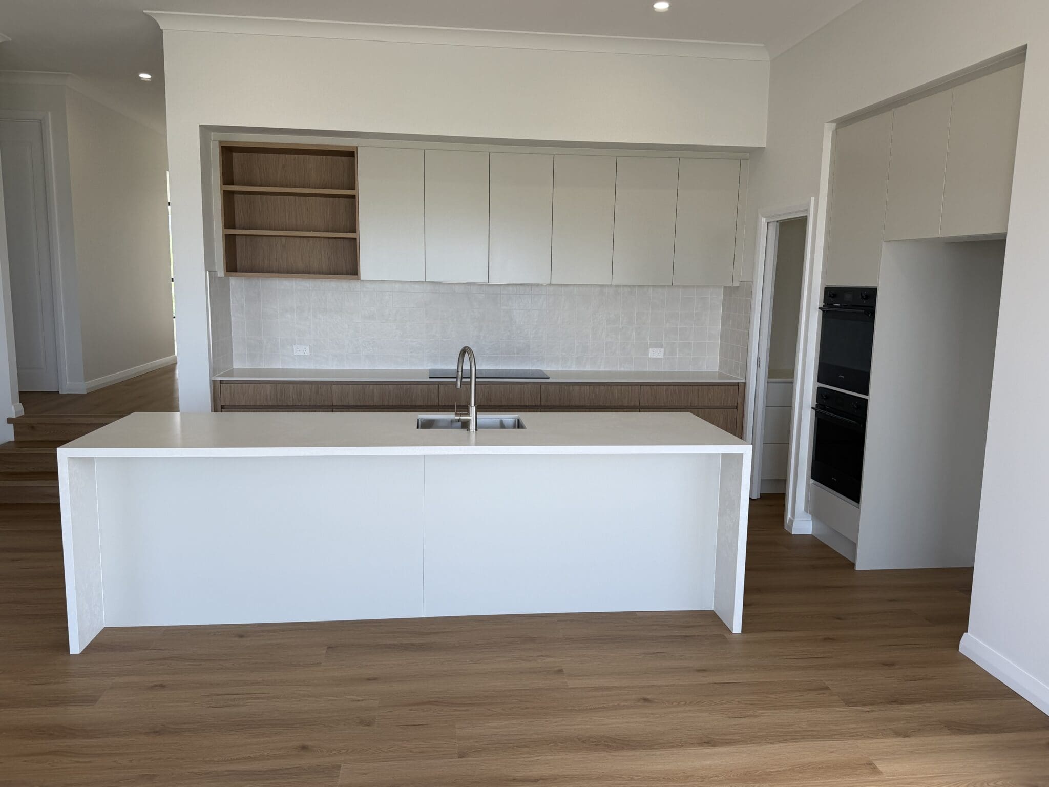Inside, the heart of the home is the open plan kitchen, living, and dining area, designed for both everyday living and entertaining. The kitchen features a large island bench, quality cabinetry, and a warm timber finish that pairs beautifully with the light stone benchtops and neutral colour palette.
