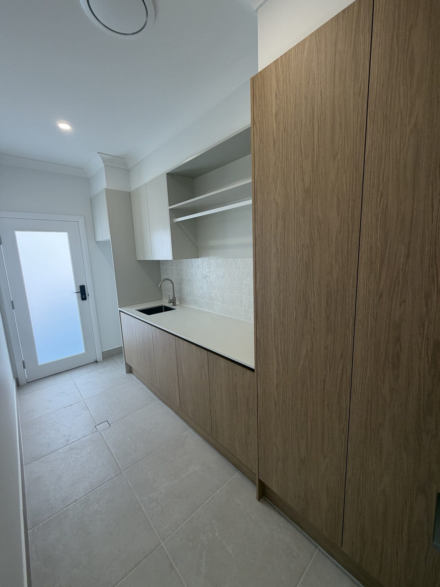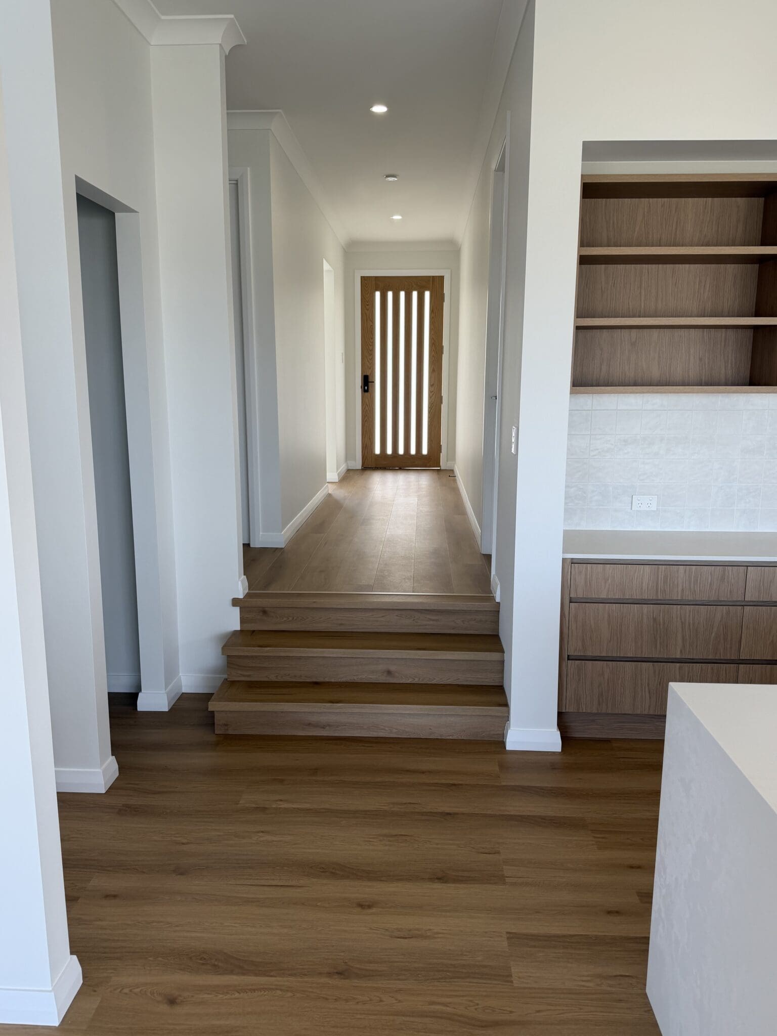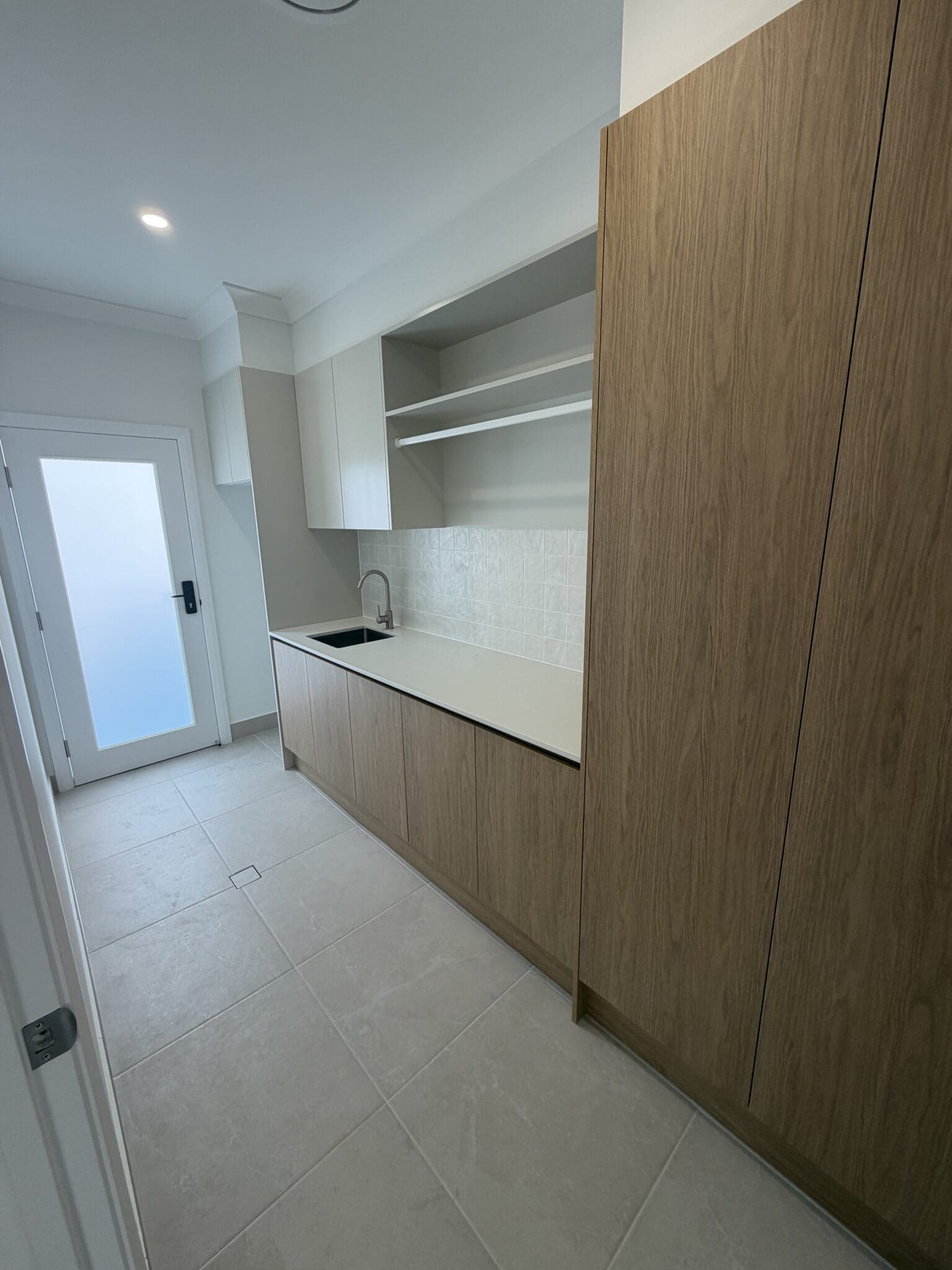 Inside, the heart of the home is the open plan kitchen, living, and dining area, designed for both everyday living and entertaining. The kitchen features a large island bench, quality cabinetry, and a warm timber finish that pairs beautifully with the light stone benchtops and neutral colour palette.
